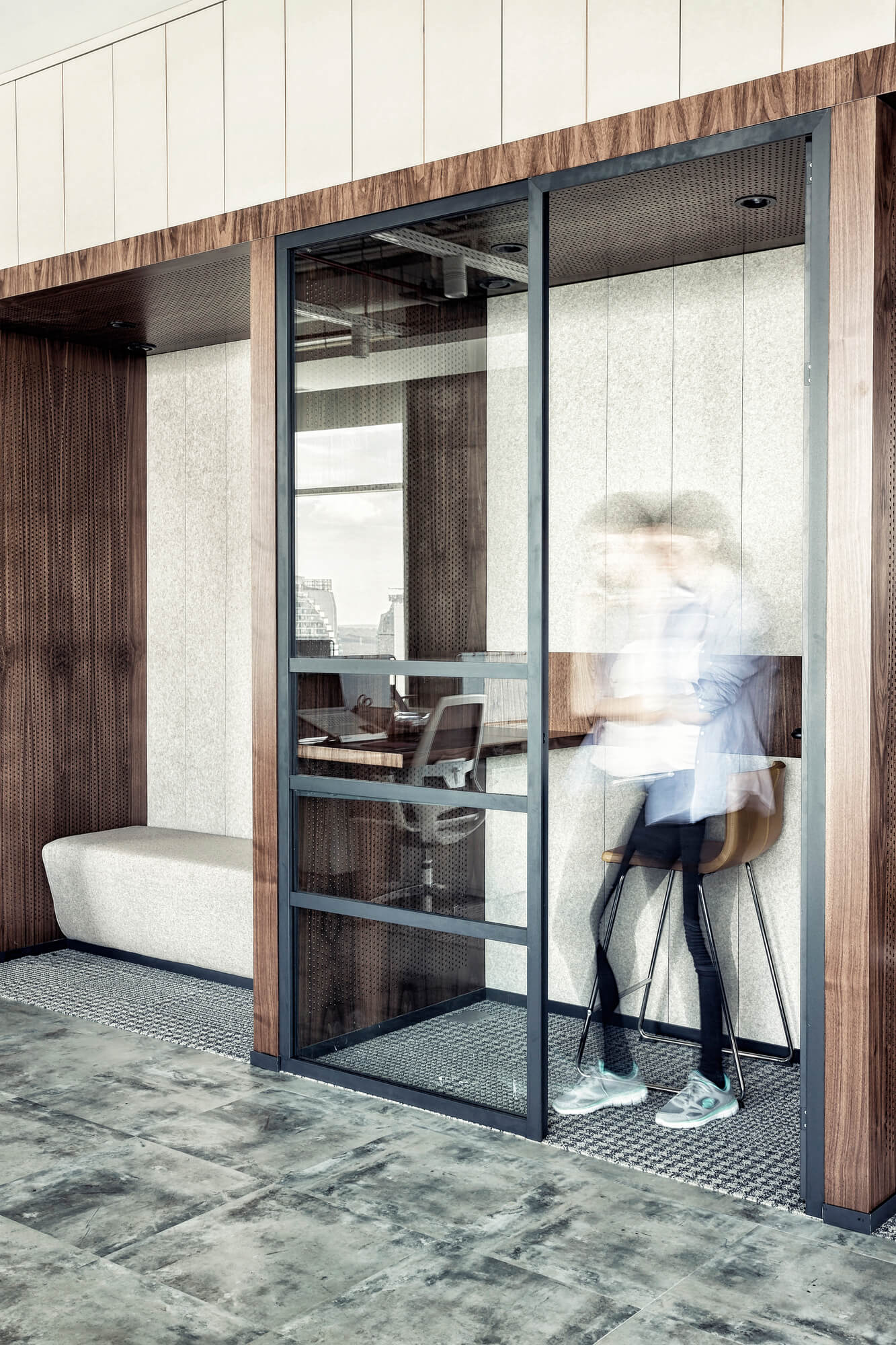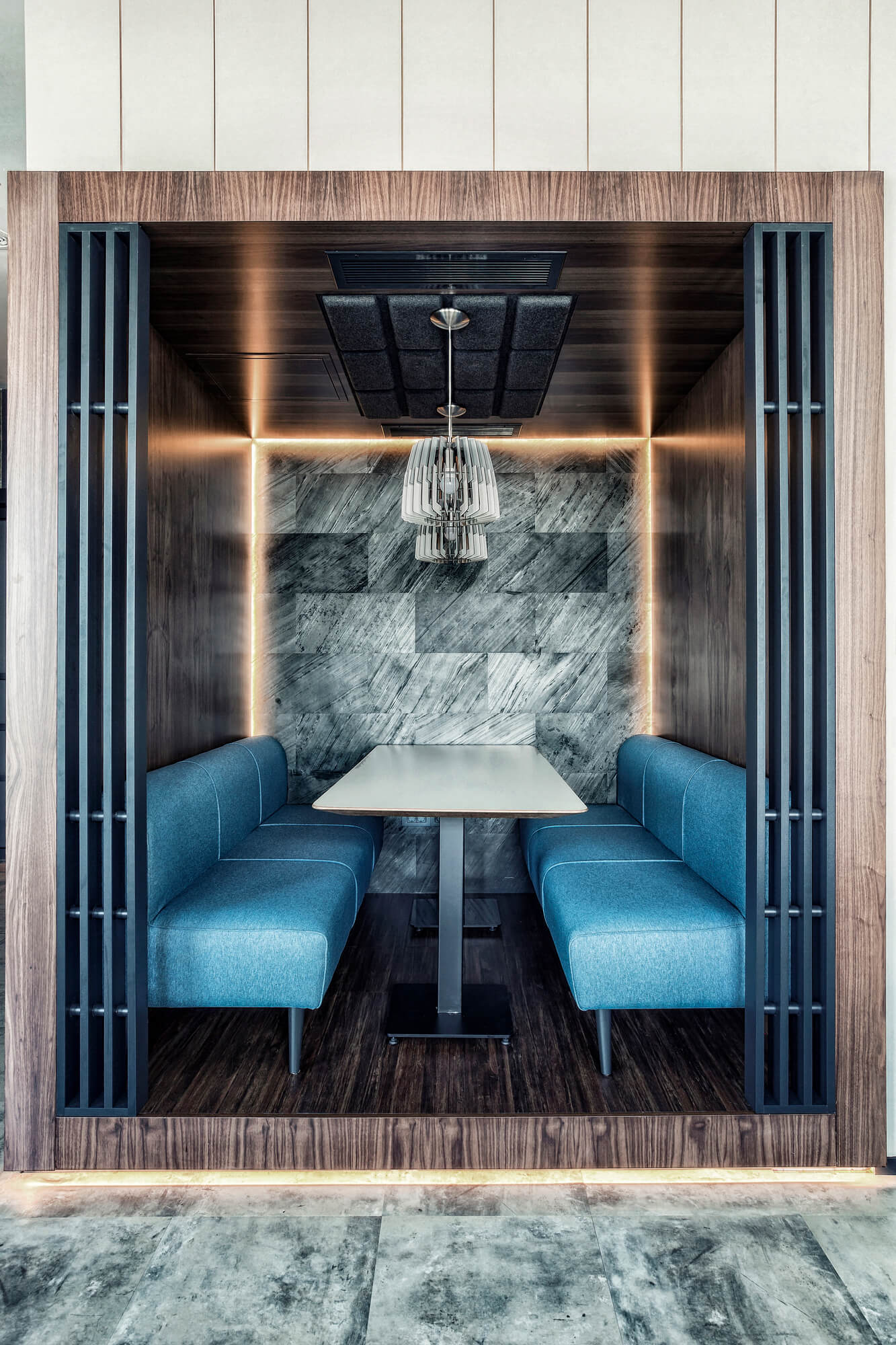 Guided by the motto “Eat Well, Live Well,” the space connects closely with nature through the use of natural materials and a restrained color palette. Wood, stone, and exposed concrete establish a balanced relationship between the brand’s values and a sustainable, human-centered environment.