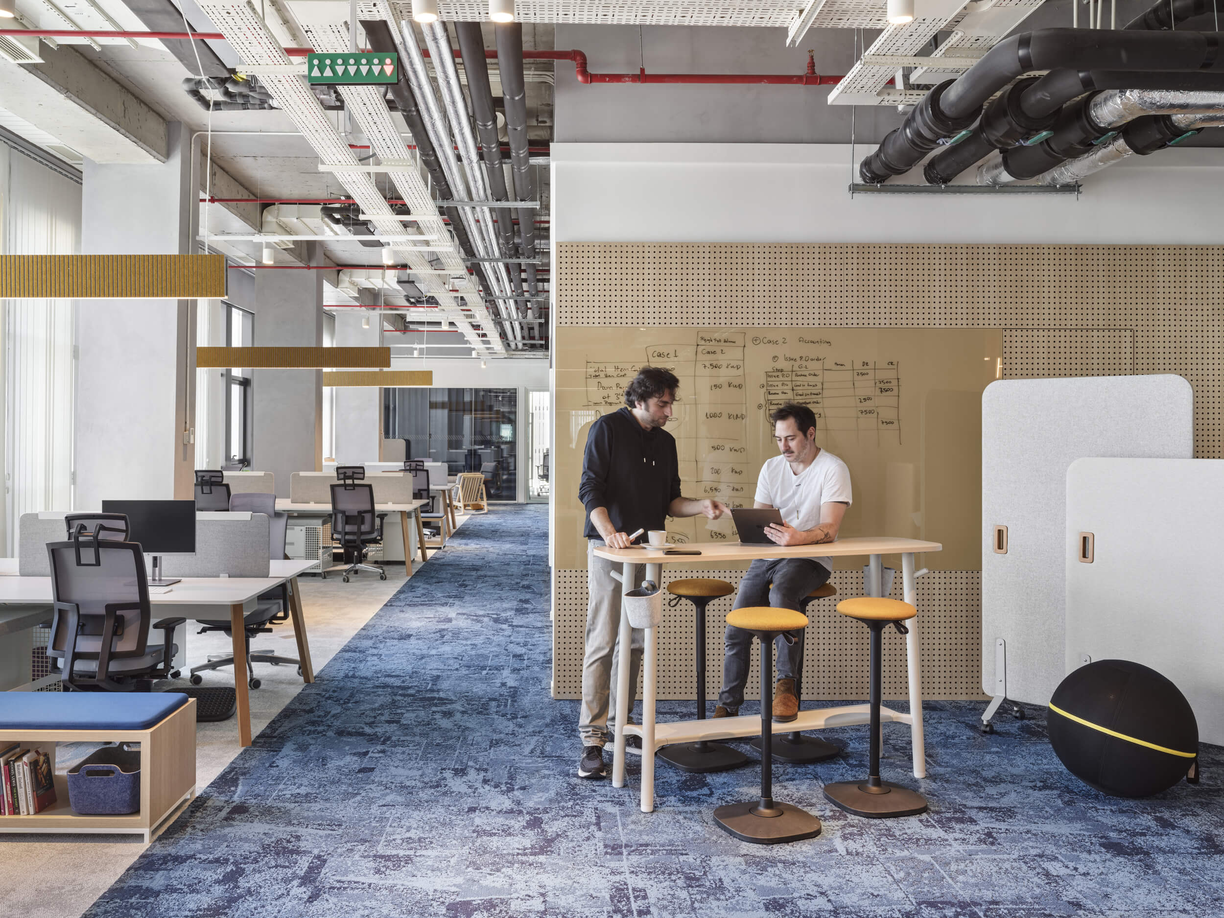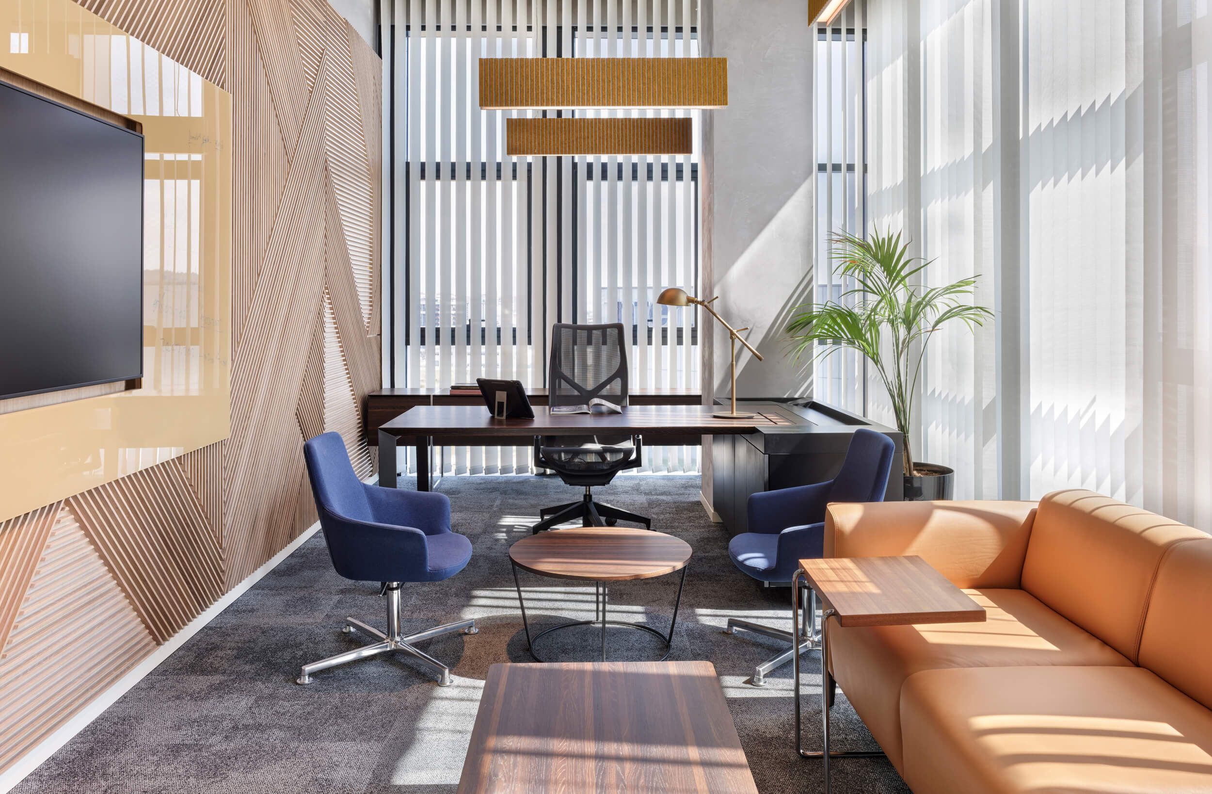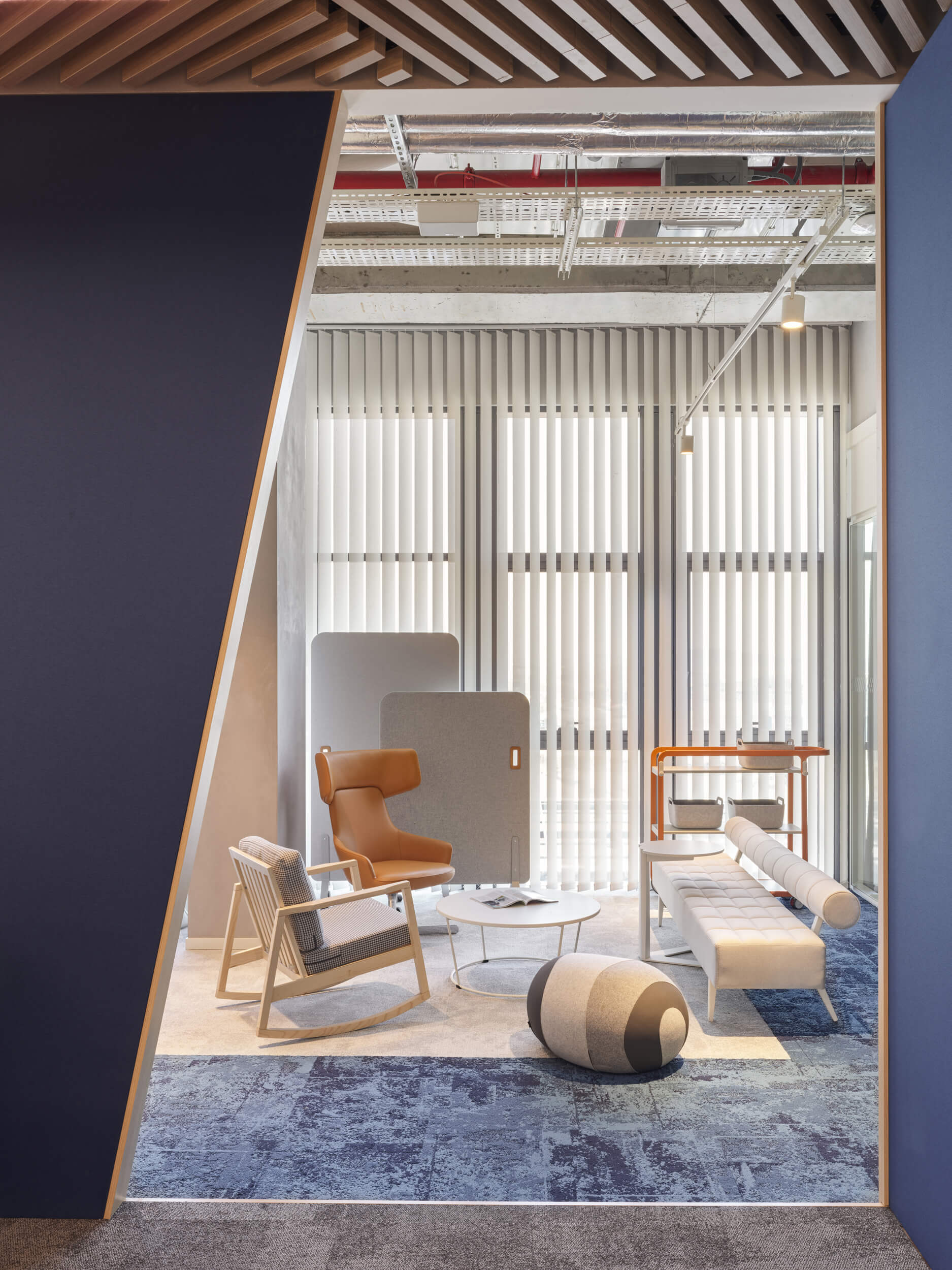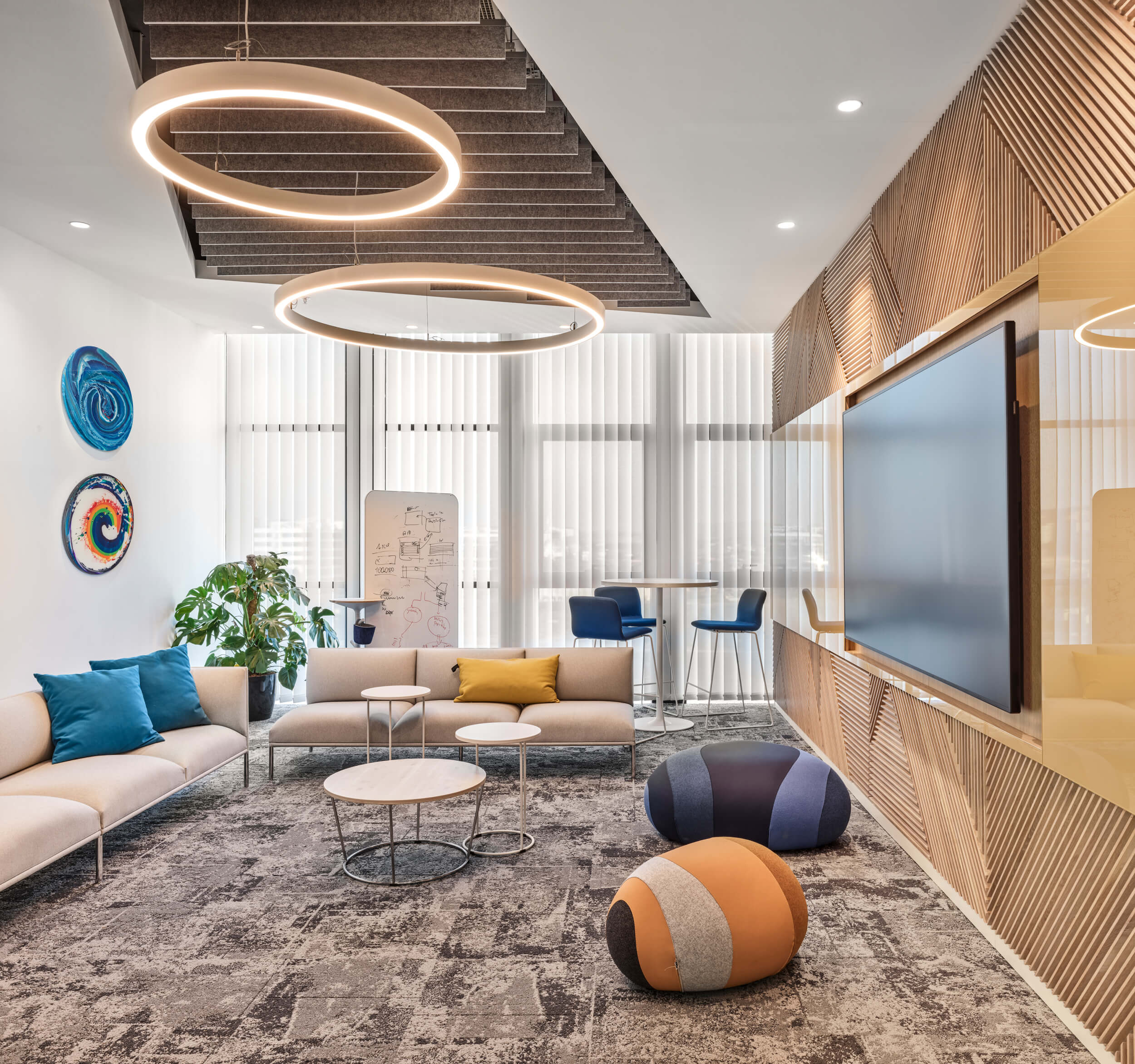 Custom-designed elements—such as integrated storage seating, acoustic lighting, ceiling baffles, and mobile components—enhance comfort, functionality, and acoustic performance. A carefully curated material palette, aligned with the brand’s identity, creates a balanced and productive environment, while modular planning ensures a flexible and evolving workplace.