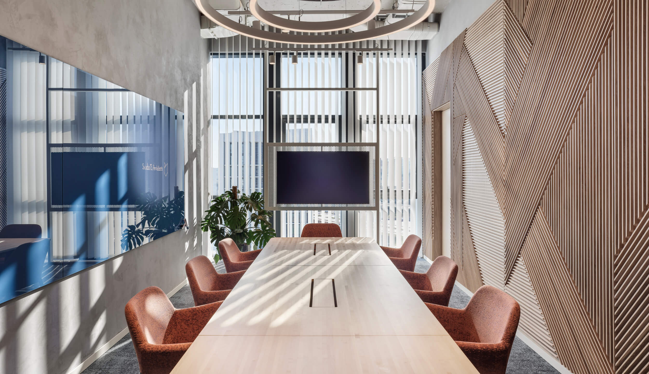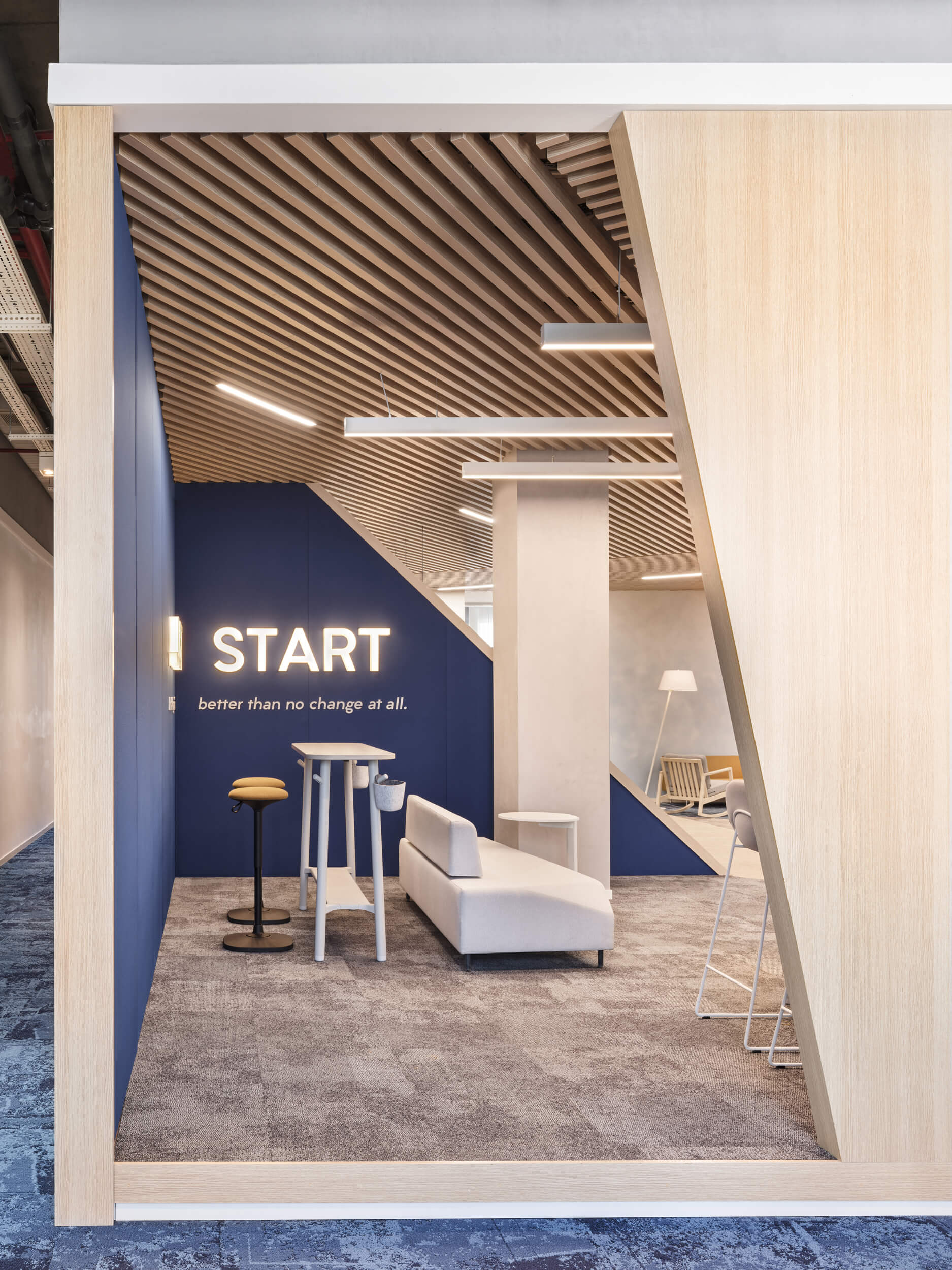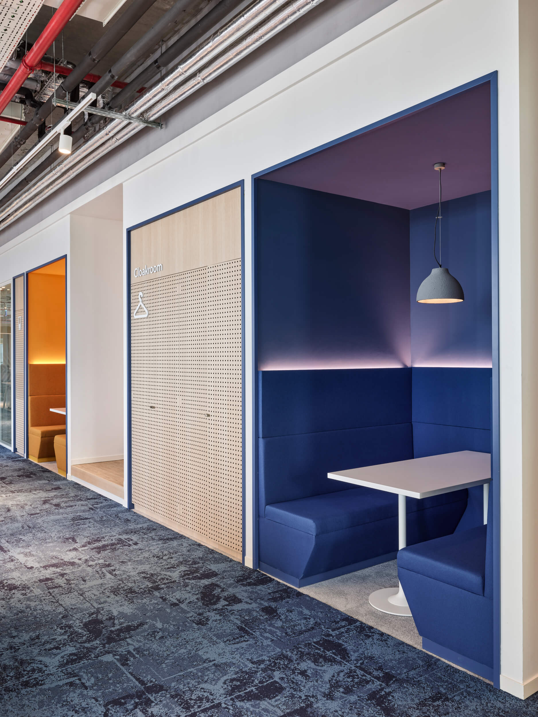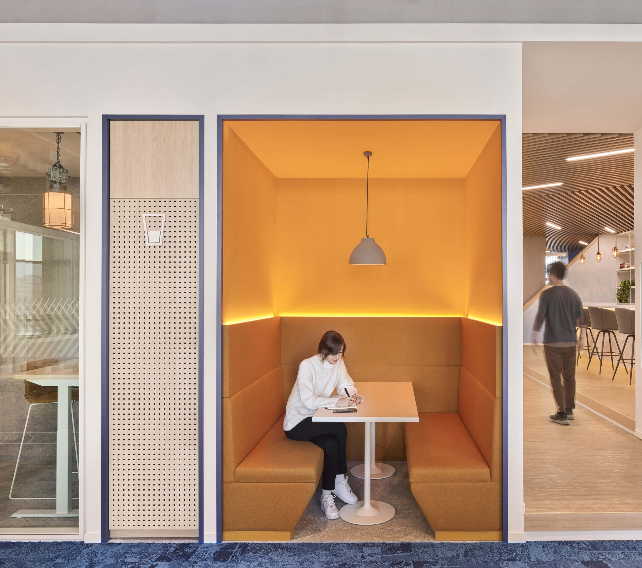 Custom-designed elements—such as integrated storage seating, acoustic lighting, ceiling baffles, and mobile components—enhance comfort, functionality, and acoustic performance. A carefully curated material palette, aligned with the brand’s identity, creates a balanced and productive environment, while modular planning ensures a flexible and evolving workplace.