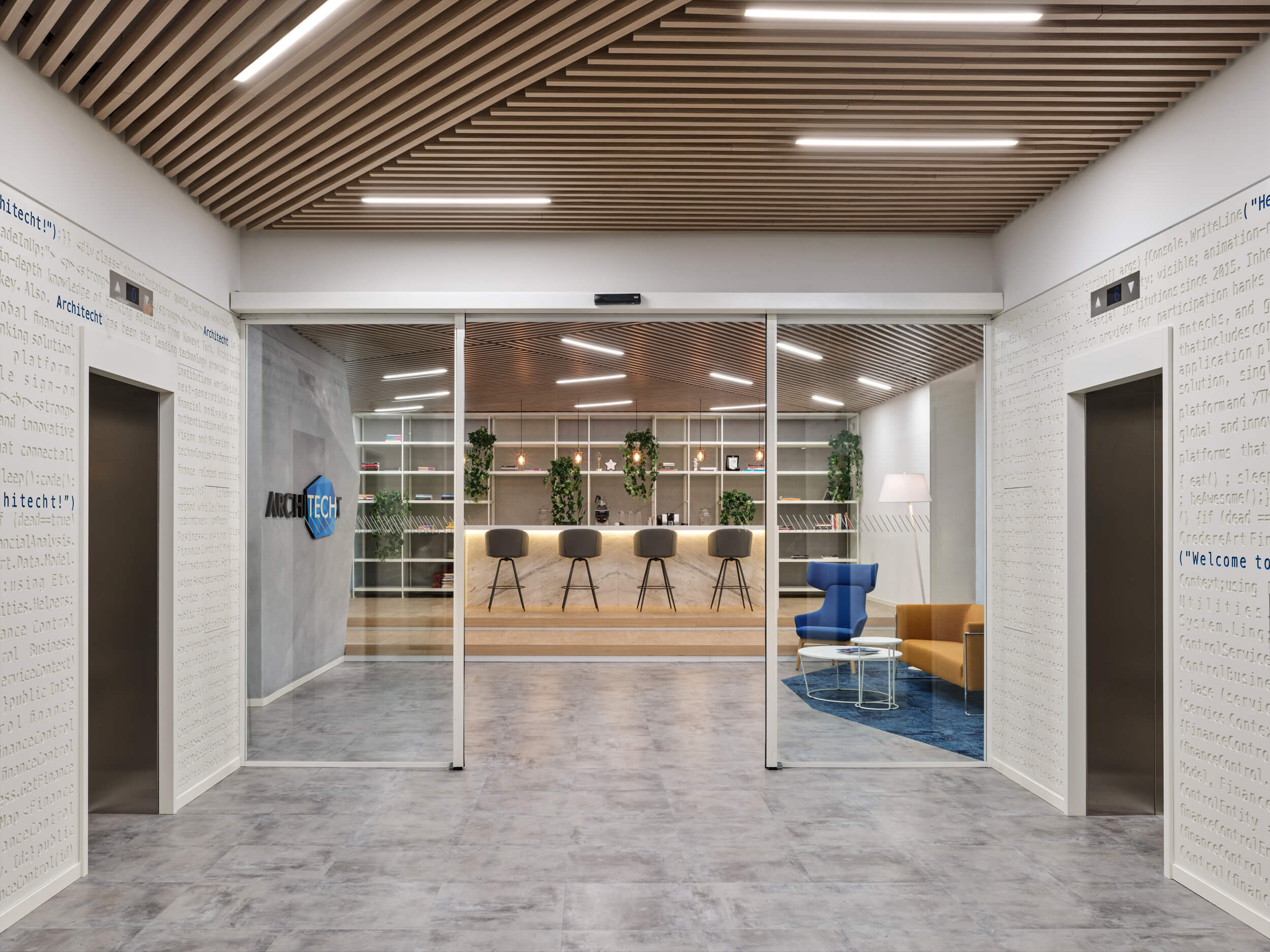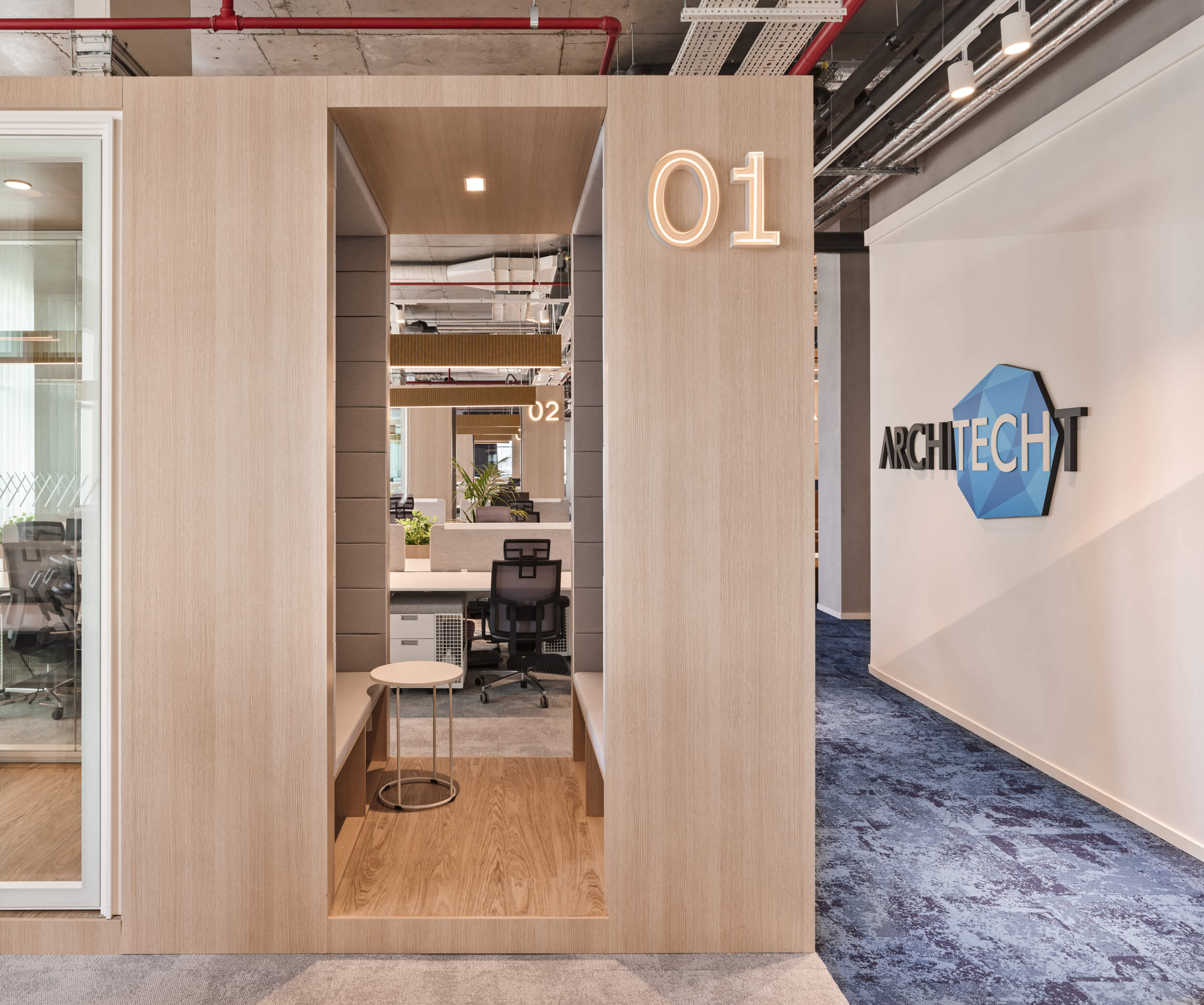 The Architecht HQ embodies a technology-driven identity through subtle references to coding language and 3D geometric patterns integrated across the space. Designed with a human-centered approach, the office brings together informal meeting areas, a social café, and flexible work zones that support both collaboration and focused work.