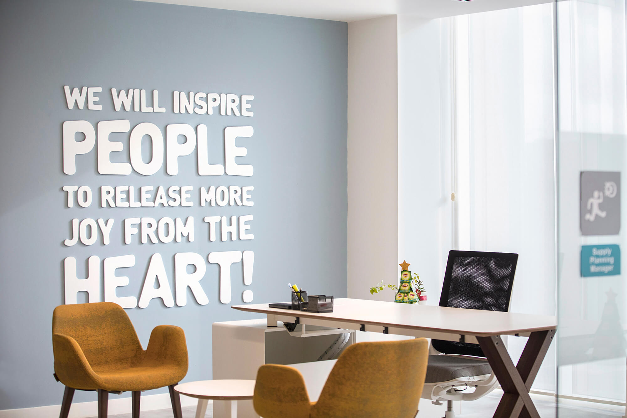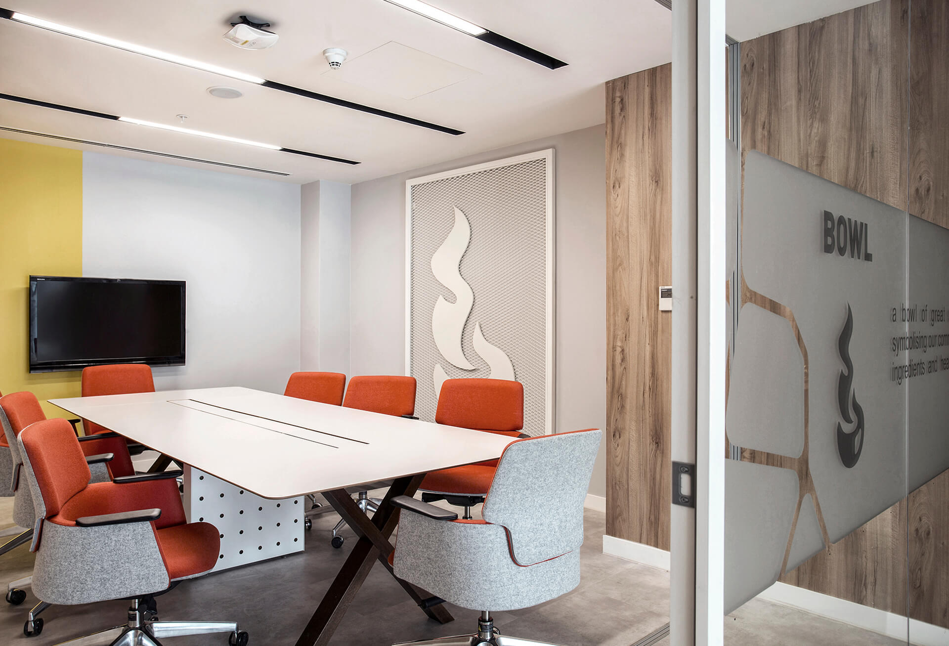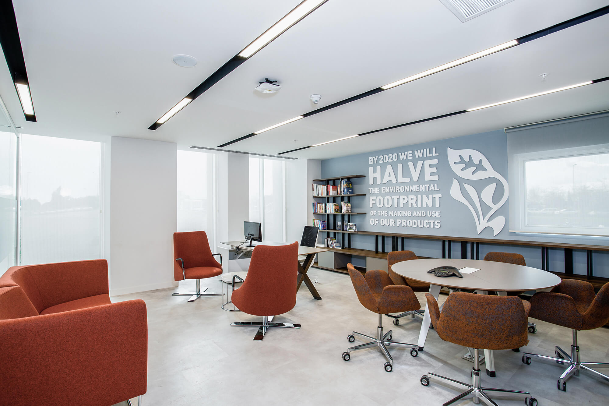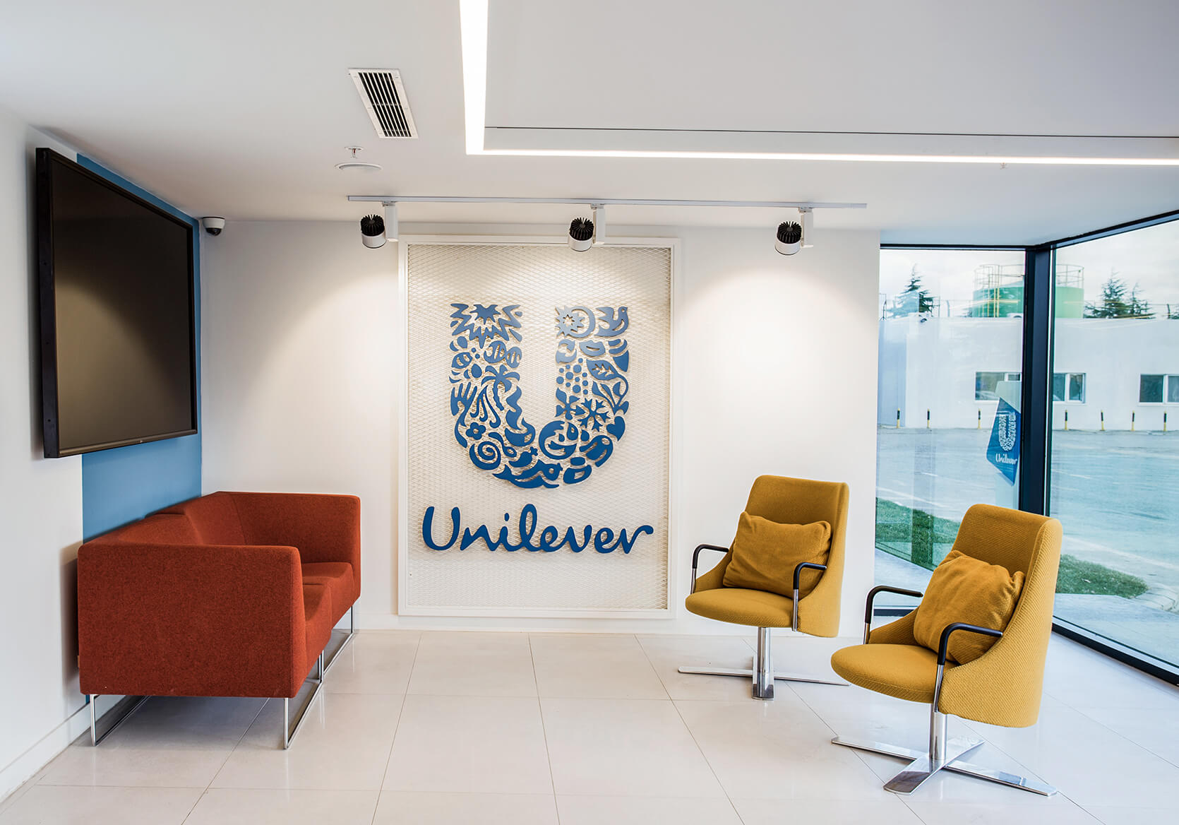 Inside, a balanced approach combines clean, neutral tones with vibrant furniture to soften the laboratory-like atmosphere. Hygienic and well-lit environments are emphasized in production and lab-related areas, while wood finishes and greenery introduce warmth and comfort. Meeting rooms, inspired by icons from the Unilever logo, each feature distinct color themes—bringing energy, variety, and a strong sense of brand expression to the workspace.