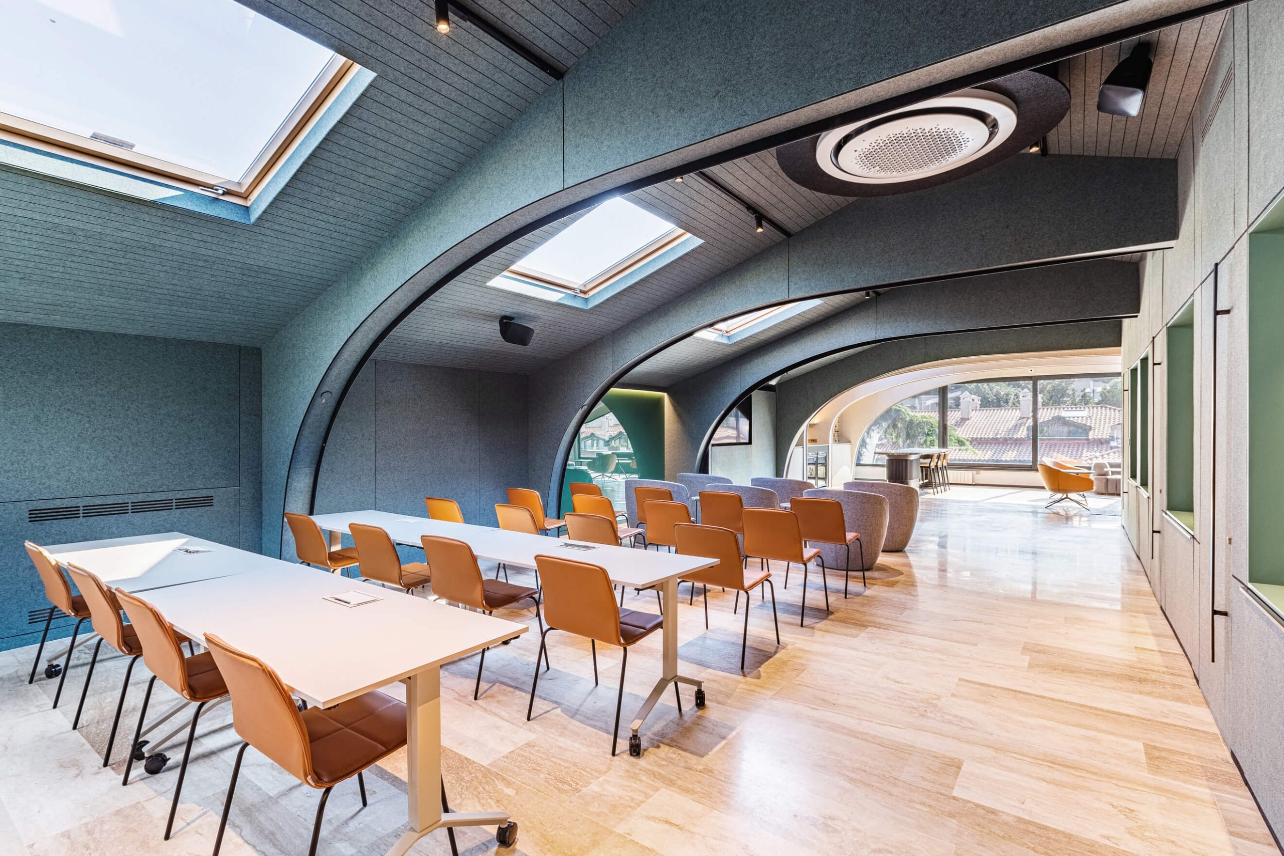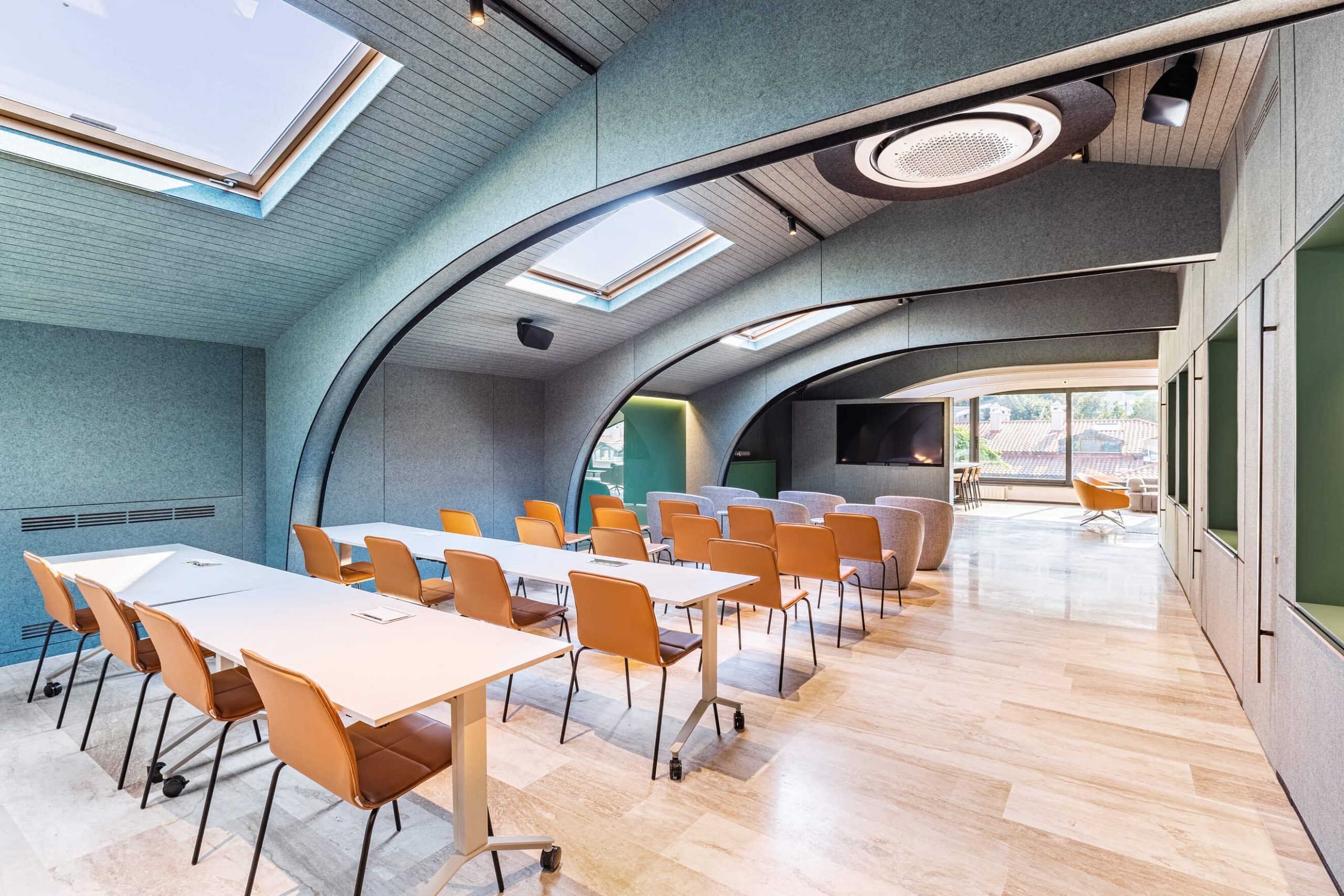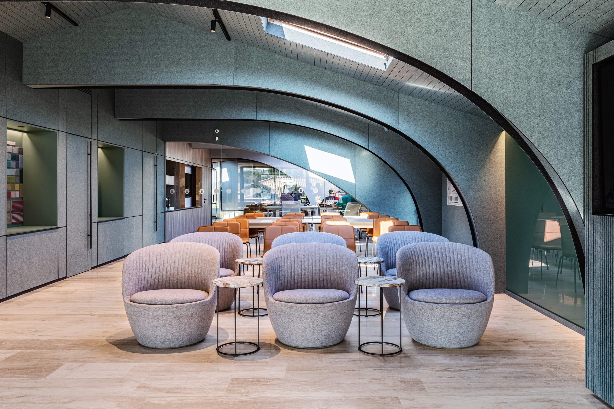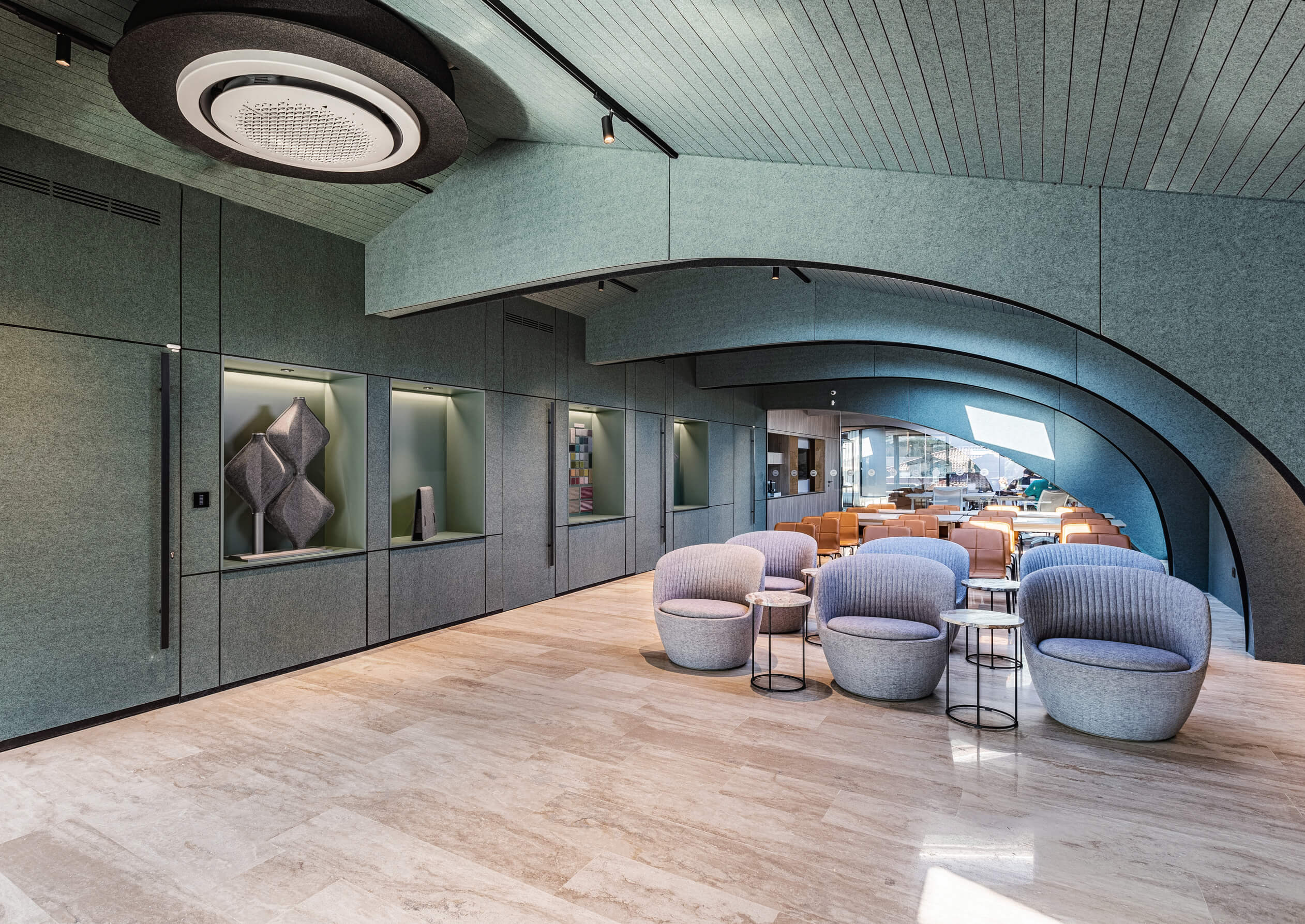Adaptable spaces support collaboration, interaction, and new experiences, accommodating meetings, brainstorming, and events. A material palette rooted in the brand—combining acoustic felt, wood, marble, and greenery—creates a warm, inspiring, and immersive environment.