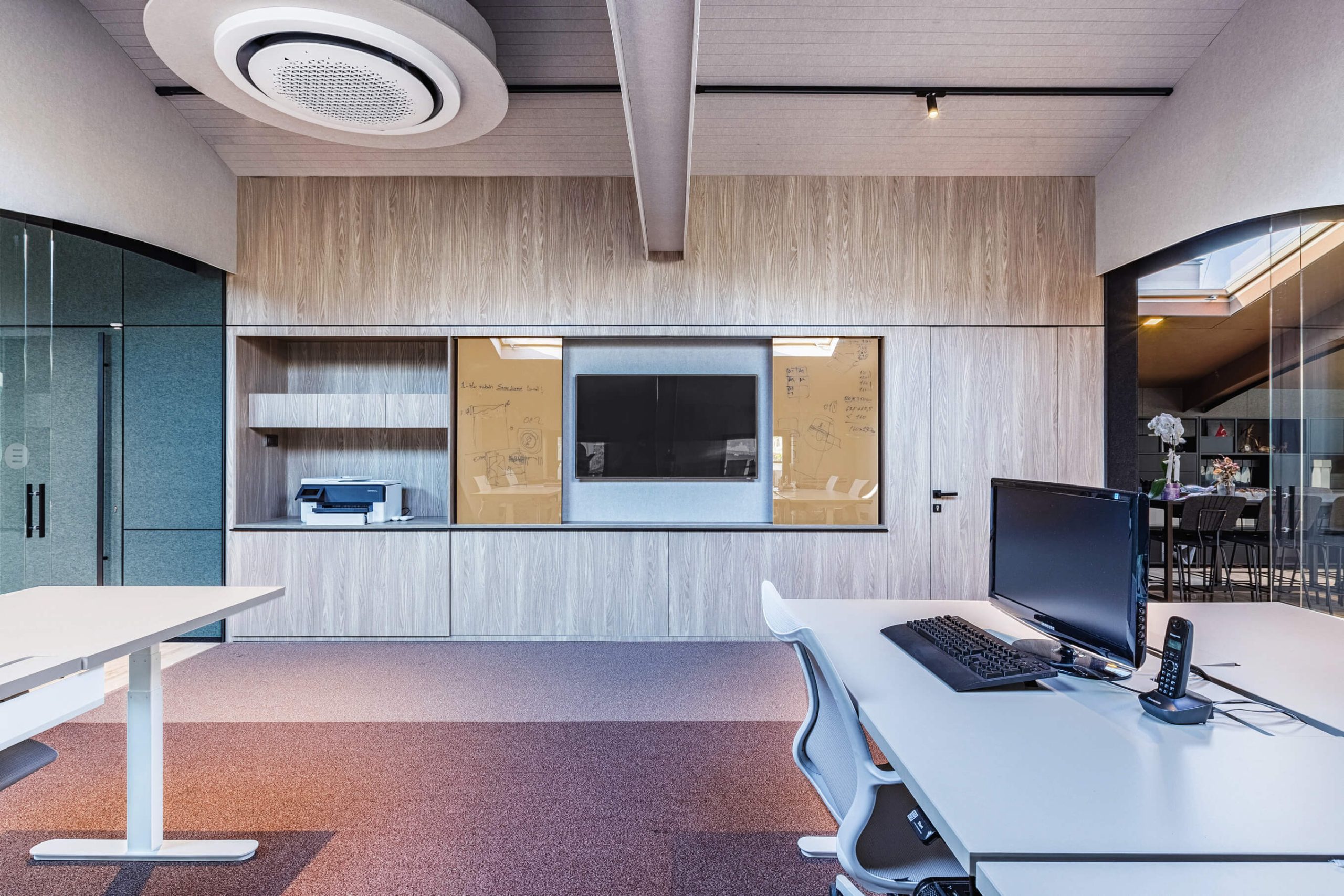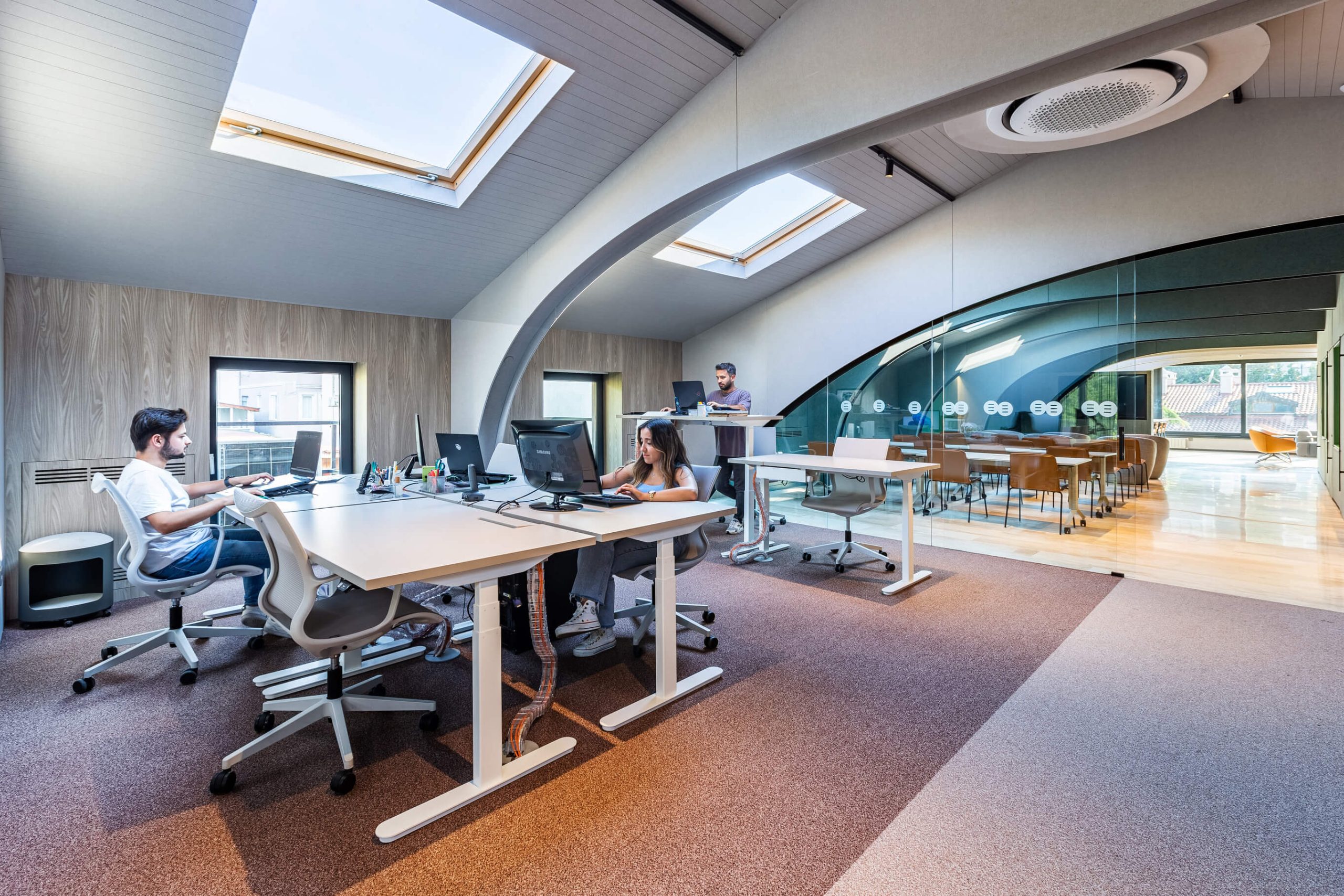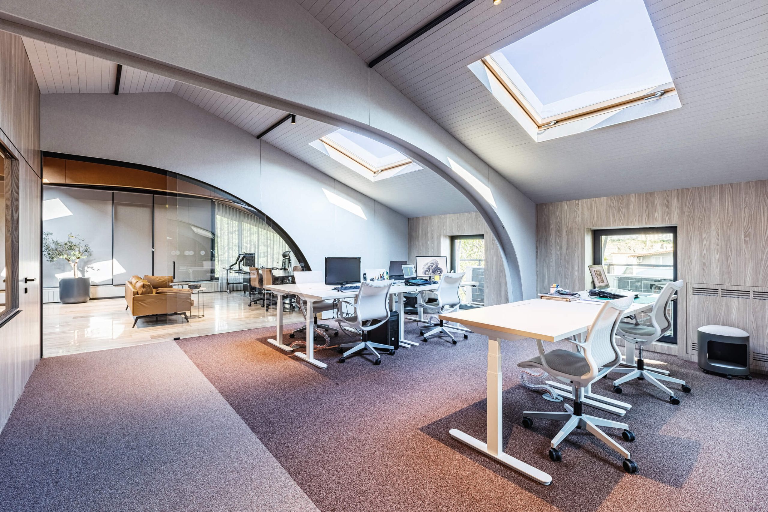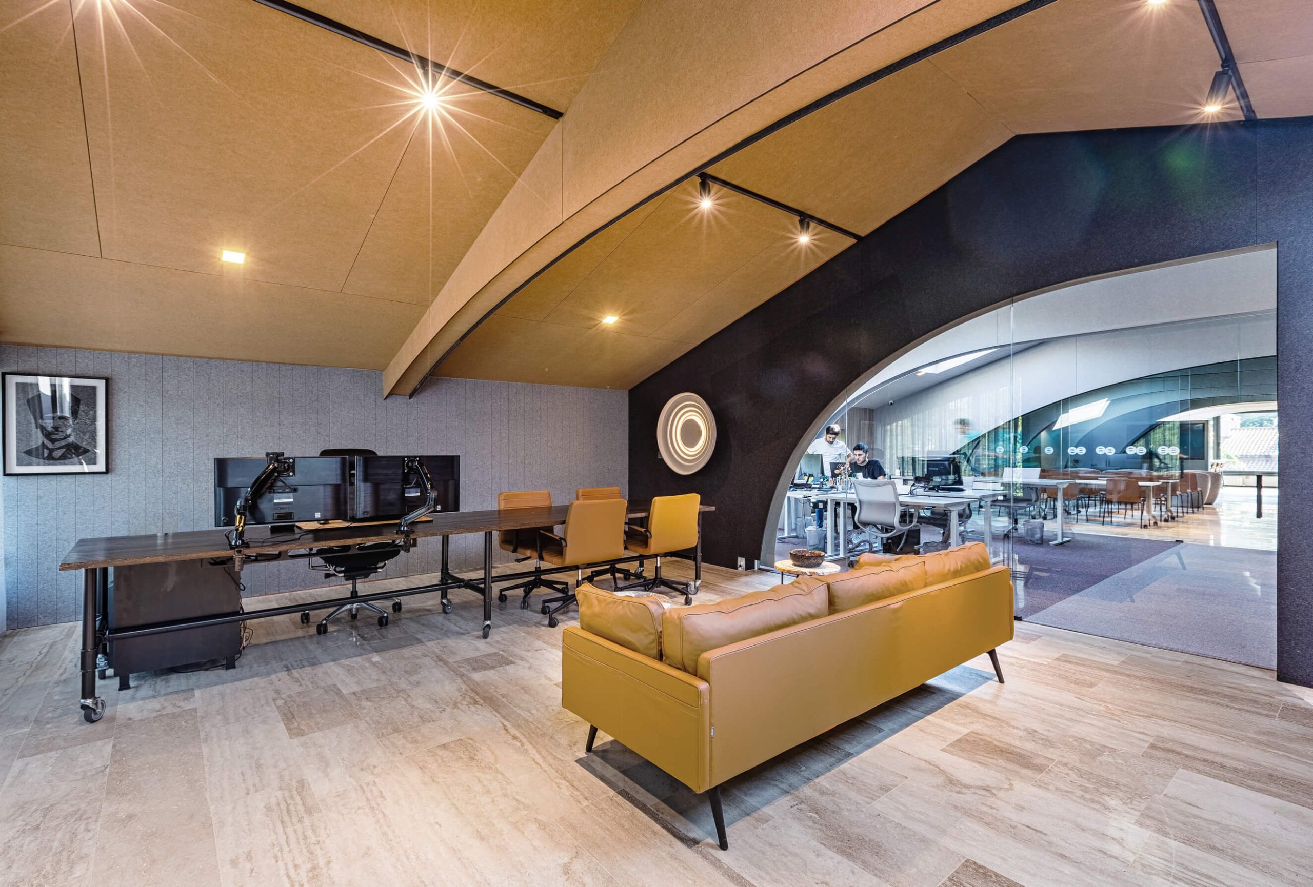Adaptable spaces support collaboration, interaction, and new experiences, accommodating meetings, brainstorming, and events. A material palette rooted in the brand—combining acoustic felt, wood, marble, and greenery—creates a warm, inspiring, and immersive environment.